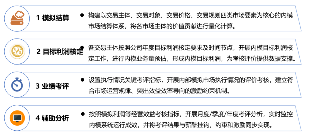 內部模擬市場(簡稱“內模市場”)是將企業內部各單位視同獨立市場主體進行管理,引入市場交易機制,將以往內部單位之間無償提供的支撐服務按照市場化模擬結算,在內部各單位之間形成完整的收入、支出循環,從而計算出各單位的模擬收入和模擬成本。內模市場以“模擬利潤”為核心,完整量化反映各單位的真實經營成果和價值貢獻,使企業管理者了解各單位的真實經營水平和盈利能力,同時激活企業內部各單位各部門各員工提質增效的動力,從而將外部市場壓力在企業內部層層傳導,打造創新管理機制,煥發企業發展活力。