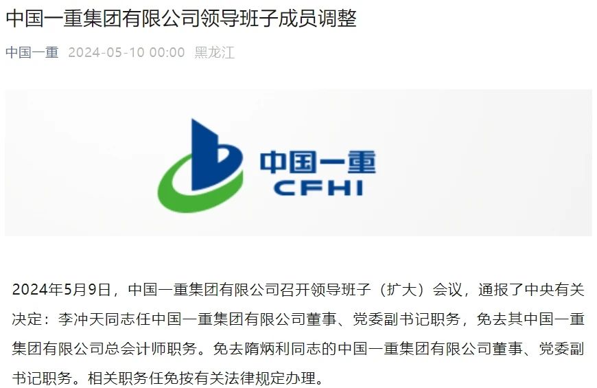 5月9日,中國一重集團(tuán)有限公司召開領(lǐng)導(dǎo)班子(擴(kuò)大)會議,通報(bào)了中央有關(guān)決定:李沖天同志任中國一重集團(tuán)有限公司董事、黨委副書記職務(wù),免去其中國一重集團(tuán)有限公司總會計(jì)師職務(wù)。免去隋炳利同志的中國一重集團(tuán)有限公司董事、黨委副書記職務(wù)。相關(guān)職務(wù)任免按有關(guān)法律規(guī)定辦理。
