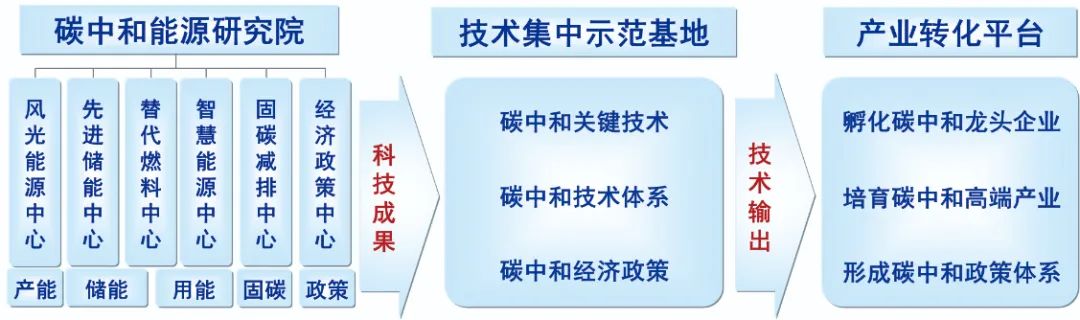要想加速技術發展,我認為還需要大幅度縮短技術研發到產業應用的時間,探索技術研發-集中示范-產業轉化全鏈條貫通的新型研發組織模式。比如,可以聯合政府、企業與科研單位各方力量建立新型科研組織(圖1示),通過碳中和能源研究院組織跨學科的科研隊伍攻關碳中和新技術,通過技術集中示范基地(圖2)促進新技術間的協調融合發展,通過技術產業轉化平臺支撐成熟技術規模化應用。最終,我們依托新型研發組織,貫通技術研發-集中示范-產業轉化的全鏈條,加速新技術的研發迭代。(記者 朱妍)