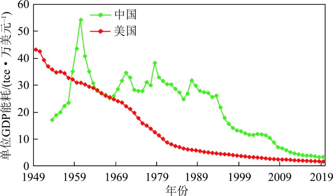 美國能源消費碳排放強度在碳達峰前期、達峰期下降幅度較小,實現碳達峰核心是提高能源效率,降低單位GDP能耗,在不大幅度增加能源消費的前提下,支撐經濟增長。2019年美國單位GDP能耗僅相當于1949年的3.9%。