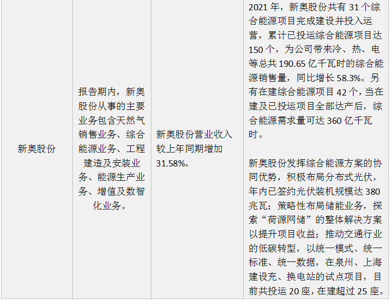 新奧股份2021年年度報告顯示,報告期內,公司營業收入較上年同期增加31.58%,主要是公司所屬子公司天然氣業務(零售、批發、直銷)氣量增加、單價上漲,以及綜合能源業務快速增長所致。在綜合能源業務方面,新奧股份重點開發低碳園區、低碳工廠、低碳建筑、低碳交通四大類客戶,以綠色低碳整體解決方案切入,大力發展終端節能、工藝優化、能源設施托管運營等用能側服務業務。