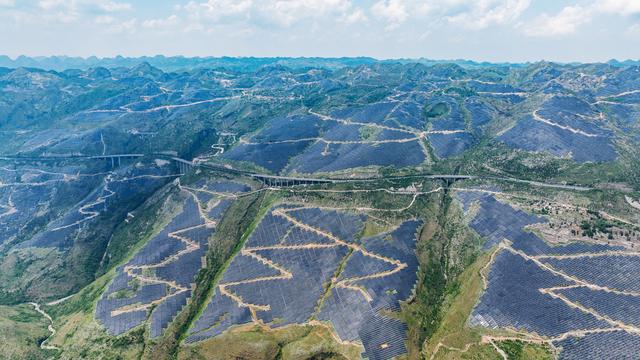 俯瞰黔中大地,不計其數(shù)的光伏板沿著山勢鋪滿了千溝萬壑,在陽光下匯成“藍色海洋”;一座座大型風力發(fā)電機矗立山巔,巨大的葉片隨風而舞,向電網源源不斷輸送綠電。