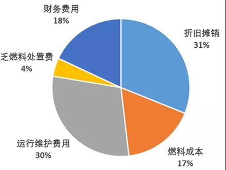 核電發電成本由折舊攤銷、燃料成本、運行維護費用、財務費用、乏燃料處置費用等組成(見圖2)。在電改背景下,核電上網面臨“量價齊跌”壓力,經濟性提升壓力日益增大,并進一步向上游傳導至核燃料加工產業。