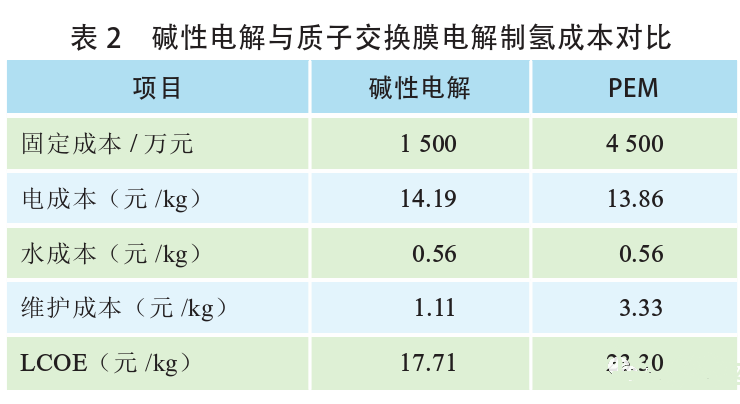 以堿性電解和PEM電解項(xiàng)目(1000Nm3/h)為例,假設(shè)項(xiàng)目全生命周期為20年,運(yùn)行壽命9萬(wàn)h,固定成本包裹電解槽、氫氣純化裝置、材料費(fèi)、土建費(fèi)、安裝服務(wù)費(fèi)等項(xiàng)目,電解以0.3元/kWh計(jì)算,成本對(duì)比見表2。