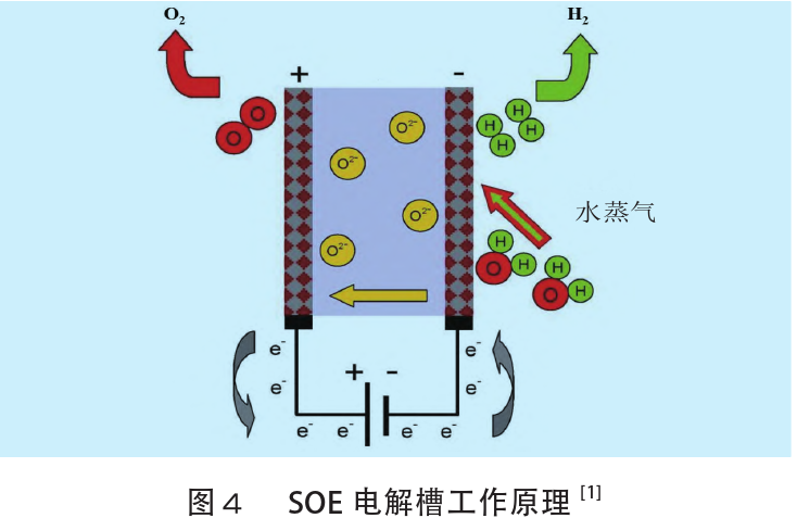 固體氧化物電解槽(SOE)利用高溫水蒸氣(600~900℃)電解,效率高于堿性電解槽和PEM電解槽。20世紀(jì)60年代,美國(guó)和德國(guó)就開始進(jìn)行SOE高溫水蒸氣的相關(guān)研究。SOE電解槽的工作原理如圖4所示。循環(huán)氫氣和水蒸氣從陽(yáng)極進(jìn)入反應(yīng)系統(tǒng),水蒸氣在陰極電解成氫氣,陰極產(chǎn)生的O2–通過固體電解質(zhì)移動(dòng)到陽(yáng)極,重新結(jié)合形成氧氣并釋放電子。