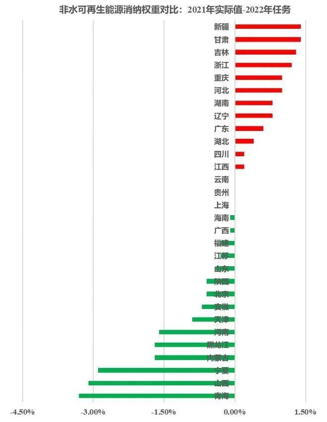 但從非水可再生能源消納權重對比看,2021年實際值和2022年的任務相比,新疆、甘肅、吉林、浙江、重慶、河北等地差距比較大,這些地方的風光等可再生能源需要大力發展。
