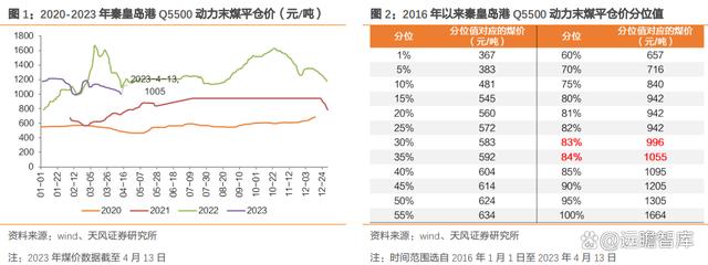 近期煤價持續回落,但仍處于歷史較高分位。2023 年 4 月 13 日秦皇島 Q5500 動力末煤平倉價為 1005 元/噸,較年內 1 月份高點(1215 元/噸)下降 17.28%,較 2022 年以來峰值(1664元/噸)已回落 39.60%。歷史對比來看,當前秦皇島 Q5500 動力末煤平倉價位于 2016 年以來的 83%~84%分位高點,仍處于歷史高位。