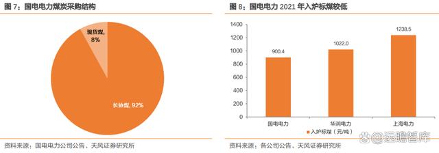此外,上市公司國電電力充分利用集團優勢,長協煤占比高,有效緩解燃料成本壓力。公司充分利用國家能源集團“煤電路港航”一體化產業協同優勢,提升內部優質長協煤炭資源比例及兌現率。2021 年,公司共采購煤炭 1.91 億噸,其中長協煤總量 1.75 億噸,占比92%。公司把握采購結構和節奏,優化采購煤種和熱值,深入開展精細化配煤摻燒;在燃料智能化、智能發電、電力安全生產標準化等方面,開展了很多前沿探索,積累了很多成果經驗,管控水平行業領先。從 2021 年入爐標煤來看,公司僅為 900.4 元/噸,明顯處于行業較低水平。