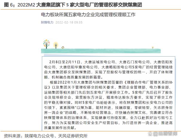 ? 大唐集團:2022M2 將旗下信陽、信陽華豫、略陽、運城、石門 5 家大型電廠的管理權移交給陜煤集團,實現控股權與管理權的統一。