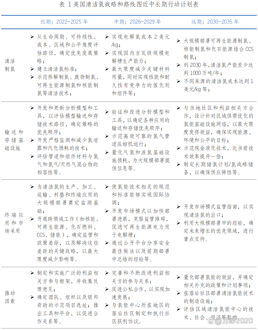 美國是最早發展氫能的國家,多年來始終將氫能作為重要能源戰略儲備技術,持續支持氫能全產業鏈技術研發,并加快示范創建和戰略部署,以期實氫能產業規模化發展。2021年7月美國能源部(以下簡稱“DOE”)宣布投資5250萬美元用于綠氫技術的研發,這筆資金將惠及多項氫能研發項目,旨在十年內將氫能成本降低80%,達到每千克1美元。11月DOE又發布《碳中性氫能技術基礎科學》研發指南,明確了高效新型電解水制氫、氫機理等4個優先研發方向。2022年2月,DOE下屬化石能源和碳管理辦公室宣布2800萬美元的聯邦資金,用于推動綠氫作為一種無碳燃料用于交通、工業和電力生產。2022年11月,DOE發布《國家清潔氫能戰略和路線圖(草案)》,制定2022-2035年近、中、長期清潔氫能發展行動時間表,如表1所示,明確在制氫、儲氫、運氫及終端應用的各階段發展目標。此外,美國于2023年6月發布首個國家能源戰略規劃路線圖。