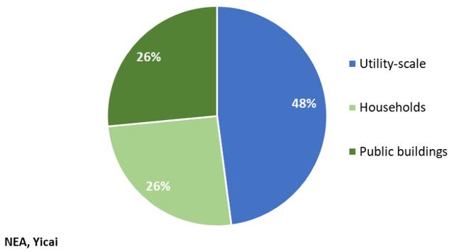 大多數今年安裝的太陽能發電裝置來自于小型項目,這些項目將太陽能板置于公共建筑和私人住宅的屋頂上。2021年7月,國家能源局要求至少一半的政府辦公樓、40%的學校和醫院、30%的商業和工業建筑,以及20%的農村住宅安裝太陽能電池板。