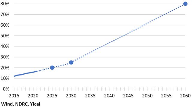 未來幾年可能會增加更多的非化石燃料產能。《“十四五”可再生能源發展規劃》預計,到2025年,非化石能源占中國能源消費的比重將從2021年的17%上升到25%。但這僅僅是個開始,根據中國的長期排放戰略,到2060年,非化石能源在能源消費中的比重將上升到80%。這表明,對低碳發電的大規模投資將持續三十多年(圖6)。