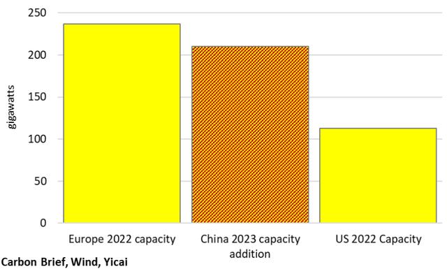 預計中國今年的太陽能發電量將增加210千兆瓦(圖3),接近美國2022年產能的兩倍,約為歐洲2022年產能的90%。