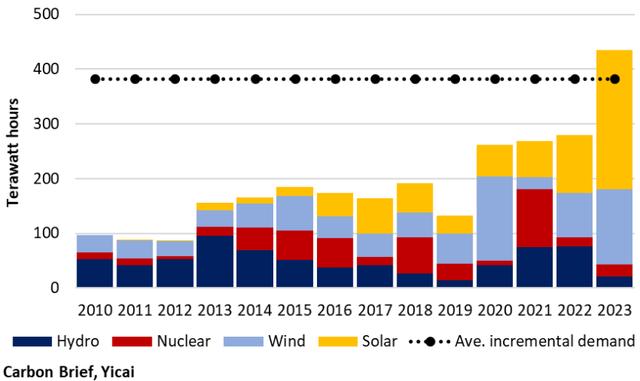 為了預測中國二氧化碳排放的路徑,碳簡報計算了電力需求的年均增幅(382太瓦時),并將其與經由綠色能源產生電量的增幅進行比較(圖5)。如果前者小于后者,那么由化石燃料產生的電量將下降,與之相關的二氧化碳排放量也會下降。碳簡報表示,如果中國保持今年的綠色能源產能增長速度,那么對化石燃料的需求將繼續下降。