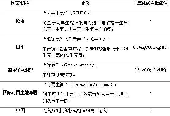 目前,國內關于“綠氨”尚無官方機構和權威組織的統一定義。行業內具備相關發聲,國內企業對綠氨的定義主要關注其原料氫是否由可再生能源電力制取,對生產過程中的碳排沒有明確的要求。