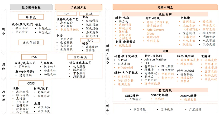 氫能產業鏈上游主要為制氫。國外主要制氫方式為天然氣重整制氫,而我國主要利用工業制氫,現有工業制氫產能約2500萬T/A,其中煤制氫產能約1000萬T/A,約占總量的40%,占比最大,成本最低,約為10-13元/公斤。其次是工業副產氫約800萬T/A,制氫成本約為10-16元/公斤。而電解水制氫的成本約為30-40元/公斤。隨著電解水制氫成本的持續下降,未來電解水制氫成為各國瞄準的方向和攻關重點。
