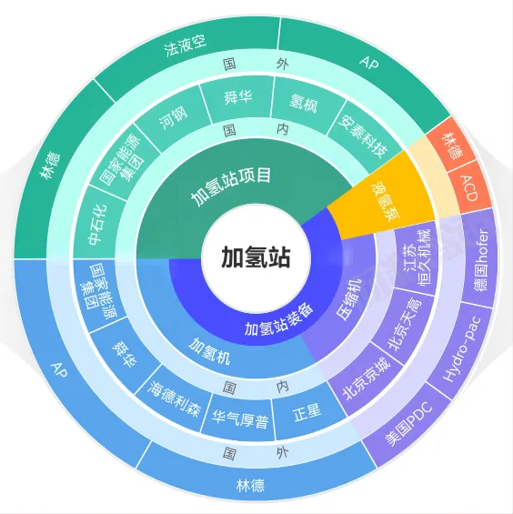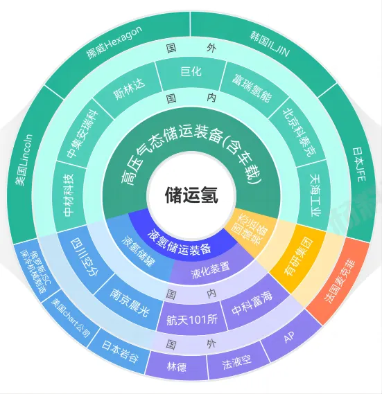 氫能產業中游主要包括儲運氫和加氫站建設。儲運氫環節,主要有高壓氣態儲氫、低溫液態儲氫、固體儲氫和有機液體儲氫等方式。當前,美國、歐洲已分別建成2600km、1500km的氫管道,而我國氫氣管道里程約400km,在用管道僅有百公里左右。儲運氫環節成為我國氫能產業亟待攻克的環節。
