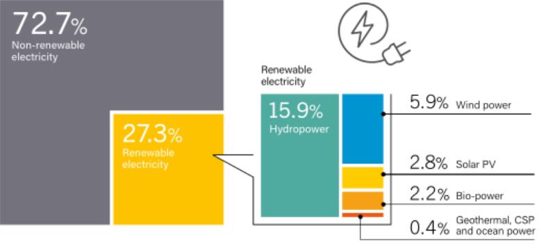 2020年版REN21《全球再生能源現況報告》中的“全球電力生產的再生能源份額”。