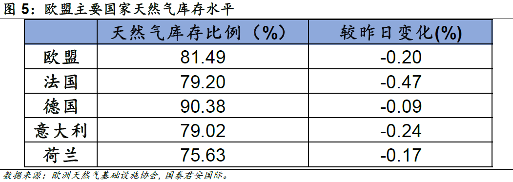 暖冬的到來極大程度上緩解了天然氣消耗的壓力,歐盟的天然氣庫存儲量超過最大儲量的80%,短期內天然氣壓力不會顯著回升。歐洲天然氣基礎設施協會(GIE)數據顯示,截止2023年1月15日,歐盟27國的天然氣儲量超過最大儲量的80%,德國作為最主要的天然氣消耗國,庫存儲量甚至超過90%。暖冬導致對天然氣消耗需求的減少可以在相當程度上緩解整體天然氣需求的壓力,短期來看,天然氣需求壓力不會顯著回升,通脹壓力有望持續放緩。