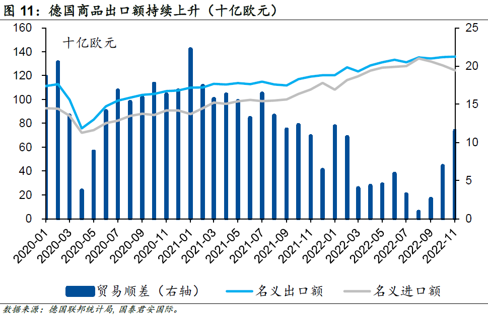 進一步看,隨著疫情的相對穩定,個人消費支出增長4.6%,對GDP增長起到了核心支撐作用。經價格調整后,2022年德國商品出口額和進口額比上年分別增長3.2%和6.7%。作為德國最為重要的貿易伙伴,中國的貿易數據已經在2022年下半年明顯下滑,這也意味著支撐德國貿易的主要力量來自于歐元區自身以及其他主要發達經濟體。