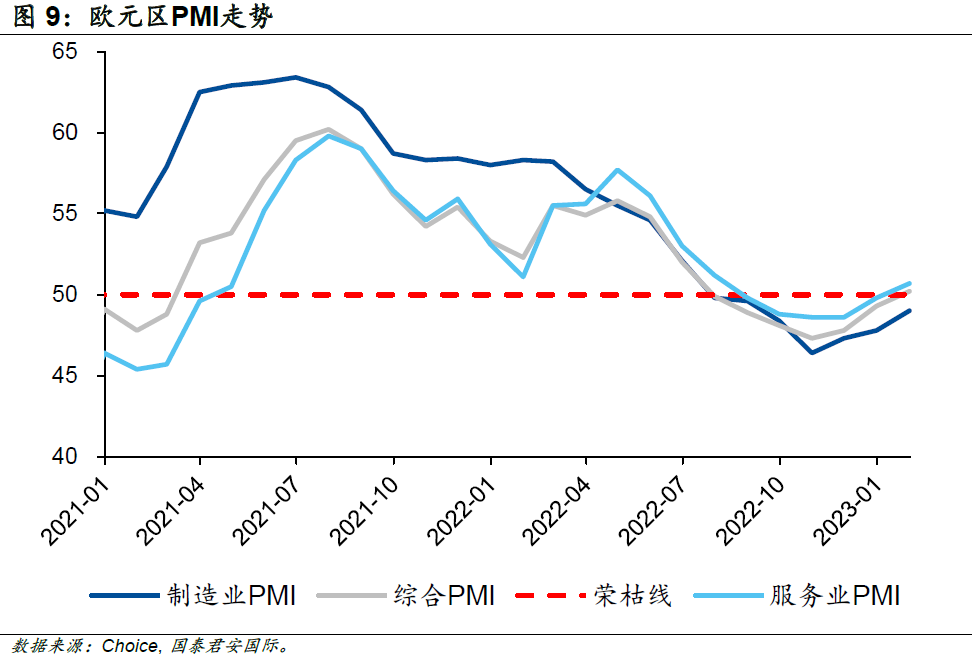 這一系列的政策效果在2022年末開始逐步顯露,歐洲的經濟指標開始出現回暖跡象。歐元區綜合PMI初值及服務業PMI初值在2023年1月扭轉了約半年的收縮趨勢,回到了榮枯線上方;雖然制造業PMI仍處于收縮區間,但是收縮幅度也大幅改善。