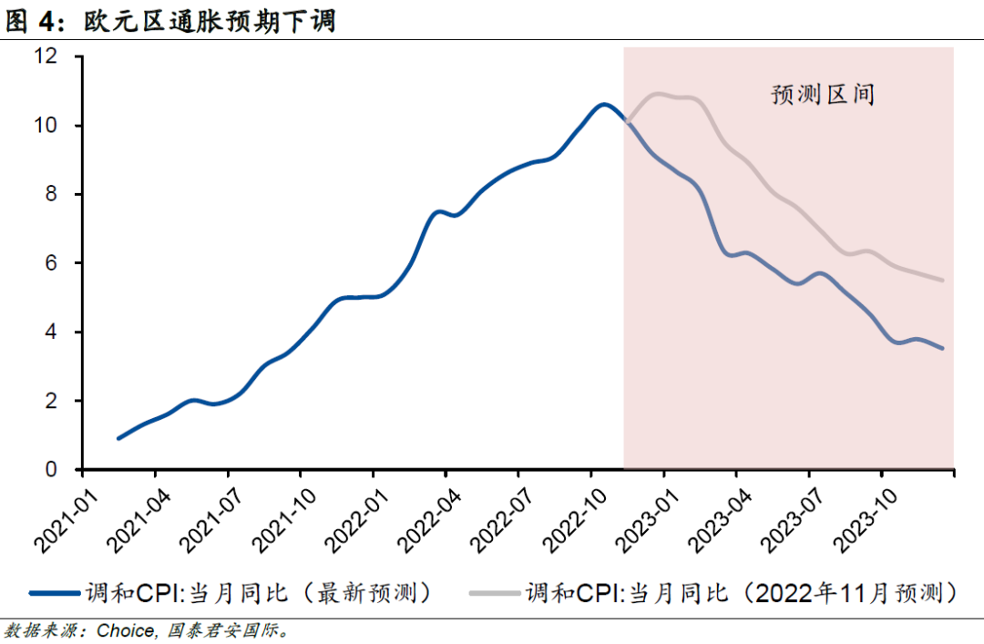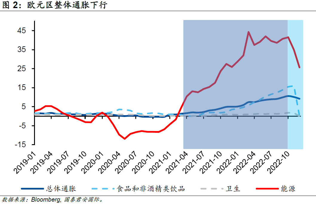 隨著天然氣價格的迅速回落,歐元區整體通脹也隨之下行。歐元區2022年12月的能源通脹已經由同年10月最高的41.5%大幅連續回落至25.7%,受此推動,整體通脹率亦由10月最高的10.6%連續回落至9.2%。