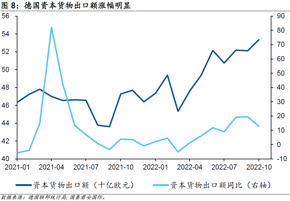 更加重要的是,為了應對中長期能源危機,歐盟各國也開始加大對制造業的支持力度,制定了“能源系統數字化”計劃,該計劃預期在2030年前在基礎設施方面投資5,650億歐元,以大力發展光伏和新能源汽車產業;除此以外,歐盟還加大了對液化天然氣產業的投資力度。德國作為歐洲經濟的最重要組成部門,受益于政策支持,其工業生產并沒有受到太多能源問題的干擾,尤其是核心的資本貨物出口額在衰退預期的背景下持續增長。