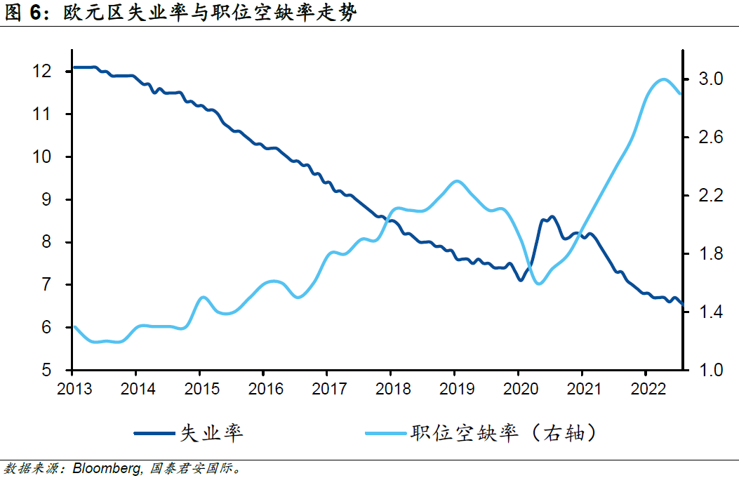 如果說天氣在很大程度上幫助了歐洲人,但歐洲經濟超預期的根本原因大概率不是因為幸運或者天氣。進一步來看,勞動力市場的火熱意味著經濟維持著較好的動能。一方面,即使在能源價格高企的去年上半年,職位空缺率都處于上行趨勢中;另一方面,在緊張的企業用工環境中,歐元區的失業率開始走低,并迭創歷史低點。在之前通脹大幅高走的背景下,歐元區多個國家的工會已經通過罷工的形式確定了未來的漲薪方案。與此同時,歐洲央行(ECB)基于通脹補償的考慮,在2022年12月的最新預測中將2022-2024年的累積工資增長較2022年9月的預測值上調1.4個百分點。