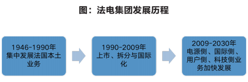 20世紀(jì)40年代,為了戰(zhàn)后重建,法國(guó)政府對(duì)電力行業(yè)實(shí)施國(guó)有化,組建了法電。1946年,法國(guó)將1450家私營(yíng)的發(fā)、輸、配電公司及燃?xì)夤緡?guó)有化,組建成法國(guó)電力公司。在法國(guó)電力工業(yè)發(fā)展初期,法電受政府要求集中力量開(kāi)展水電、火電、核電、輸電建設(shè),迅速完成了資產(chǎn)、人才、技術(shù)、資源的原始積累。