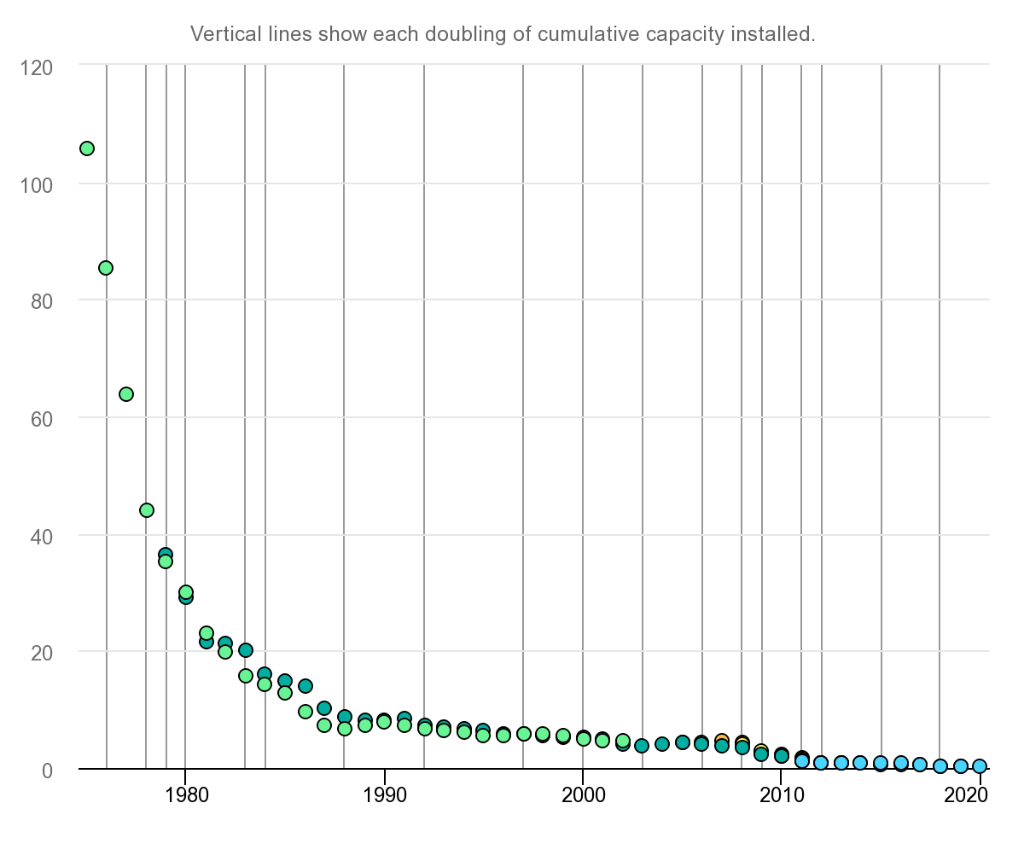 1975年,光伏的裝機成本高達105.7美元(2015年幣值,以下均同)/W,1990年,全球光伏發電量僅有91GWh。