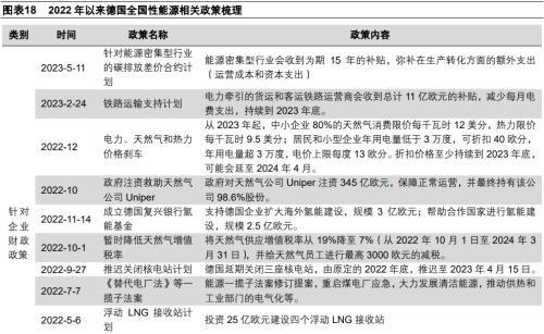 一是,大力投資可再生能源行業,減少對石化能源的依賴。德國一直謀求能源轉型,希望實現能源自主。德國在2022年1月份起大力投資新能源汽車和相關基礎設施,2月23日提前減免可再生能源附加稅,7月德國聯邦會議上通過了一攬子能源轉型法案(包括《可再生能源法》、《陸上風電法》、《替代電廠法》、《聯邦自然保護法》等),11月成立氫能基金,大力建設本國企業海外氫能產業鏈和其它國家氫能產業鏈。