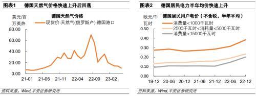 德國電力消耗密集型行業主要是紙制品、化工、基本金屬和非金屬制品等,也是工業品價格通脹較嚴重的行業。將行業電力消耗規模比上行業總產出,可以得到該行業的電力消耗密集度。德國紙制品行業的電力密集程度較高,每1歐元的產出需要投入0.51KWh的電力,化工、基本金屬和非金屬制品行業的電力密集度分別為0.4、0.36和0.33KWh/歐元。使用歐元區主要制造業PPI同比增速來衡量德國制造業的通脹形勢,可以看到2022年PPI同比最高的是焦炭和石油行業,漲幅高達56.7%;電力消耗密集度較高的紙制品、化工、基本金屬和非金屬制品行業通脹程度也較高,其PPI同比分別為26.6%、29.9%、26.6%和16.7%。