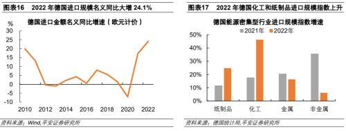 德國通過大量進口能源密集型產品來彌補本國產能缺口,體現為2022年德國化工品和紙制品進口規模指數大幅上升。2011年以來,德國進口規模較為穩定。2021年德國進口規模增長17.3%,2022年德國進口規模大幅增長24.1%。從能源密集型行業來看,剔除價格因素后,2022年化工和紙制品進口規模指數大幅上升,分別增長46.4%和24.8%,金屬和非金屬2022年進口增速則低于2021年增速。