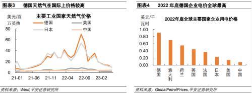 橫向比較來看,德國天然氣價格在主要工業國家中處于較高水平,德國企業電力價格在2022年底全球最高。主要工業大國中,德國和日本在天然氣供給方面較為相似,二者的天然氣價格走勢十分接近,在2022年中天然氣價格大幅攀升,并于近期價格出現了回落。但中美的天然氣價格則較為穩定,德國天然氣價格在2022年8月最高峰時分別是美國和中國天然氣價格的8倍和16倍。德國電力價格在2022年底達到了全球最高的0.91美元/千瓦時,遠高于日本、美國和中國0.23、0.15和0.09美元/千瓦時的電價。這引發市場對于德國制造業發展高度的擔憂。