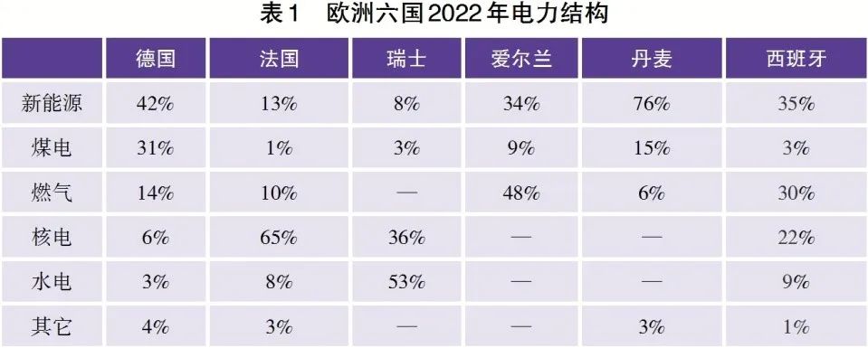 負(fù)電價(jià)主要在風(fēng)電和光伏發(fā)電高峰期出現(xiàn)。盡管發(fā)電總量已經(jīng)過剩,并引起了負(fù)電價(jià)現(xiàn)象,許多電廠仍然在持續(xù)發(fā)電,但背后的原因是多種多樣的。主要涉及三個(gè)關(guān)鍵因素:首先,電廠的應(yīng)變能力有限,難以適應(yīng)可再生能源的波動(dòng)性,還與能源結(jié)構(gòu)和電網(wǎng)結(jié)構(gòu)相關(guān)。其次,為了保持電網(wǎng)穩(wěn)定,調(diào)頻備用電廠不能輕易中止運(yùn)行,反映了電廠應(yīng)變能力方面的短板。最后,可再生能源的補(bǔ)貼政策未能精準(zhǔn)契合市場(chǎng)需求,這既涉及到需求層面,也與政策適應(yīng)性相關(guān)。從某種程度上來說,都或多或少地與發(fā)電機(jī)組和政策機(jī)制的靈活性相關(guān)。負(fù)電價(jià)的表現(xiàn)因各國情況而異,但均與各國的能源結(jié)構(gòu)和電網(wǎng)結(jié)構(gòu)及其演變有密切的聯(lián)系。(歐洲各國電力結(jié)構(gòu)見表1)