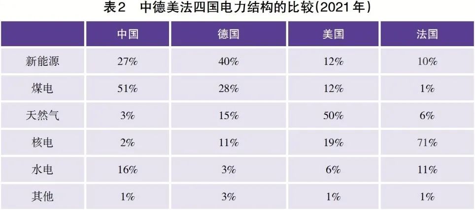 從表2中可以看出,中國與德國的電力結(jié)構(gòu)有更多的相似之處,主要都是可再生能源與煤電占比較高。而美國主要依賴天然氣發(fā)電,法國則以核電為主。因此,德國的實(shí)踐經(jīng)驗(yàn)對(duì)于中國可能會(huì)具有更高的參考價(jià)值。