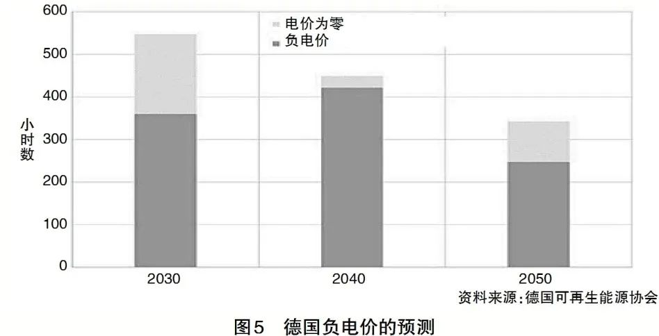 然而,負(fù)電價(jià)問題在德國能源市場(chǎng)中仍然持續(xù)存在。盡管德國對(duì)傳統(tǒng)電廠進(jìn)行了系統(tǒng)化靈活性改造,但按照德國可再生能源協(xié)會(huì)的預(yù)測(cè),到2030年德國仍將面臨300多小時(shí)的負(fù)電價(jià)情況,且這種狀況有可能直到2050年仍將維持在相同的水平(詳見圖5),主要原因是能源系統(tǒng)的靈活性仍未能達(dá)到要求,盡管預(yù)期將有大規(guī)模的儲(chǔ)能和靈活負(fù)荷投入使用。