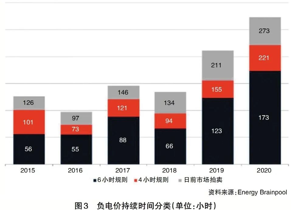 德國的研究發(fā)現(xiàn),負(fù)電價(jià)以持續(xù)6小時(shí)居多。因此,德國政府制定了相應(yīng)的限制措施,例如,如果現(xiàn)貨市場(chǎng)價(jià)格出現(xiàn)長達(dá)6小時(shí)或更長時(shí)間的負(fù)電價(jià),可再生能源的市場(chǎng)及管理補(bǔ)貼將會(huì)被取消。而法國對(duì)于負(fù)電價(jià)持續(xù)的時(shí)間上限規(guī)定則是20小時(shí)。(見圖3)