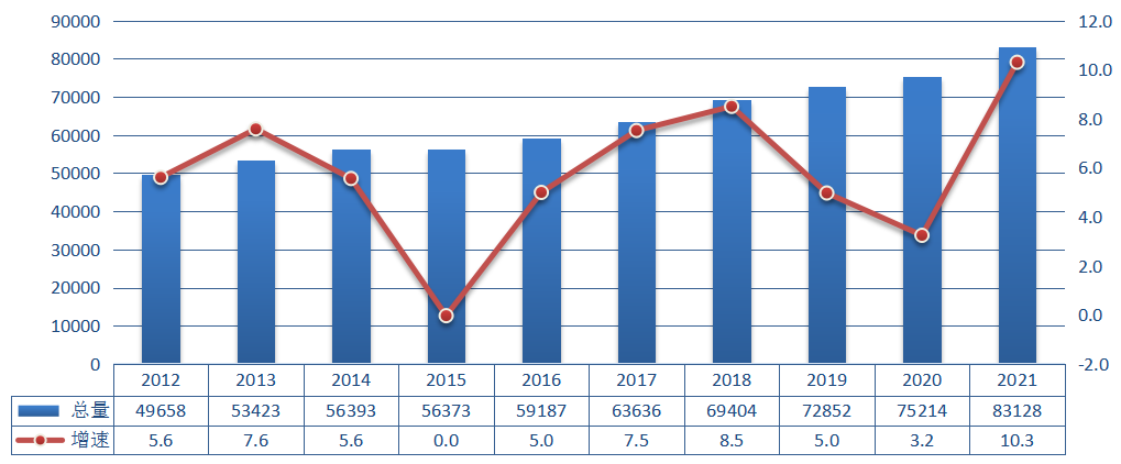 圖1 2012~2021年全國全社會用電量及增速情況(單位:億千瓦時,%)