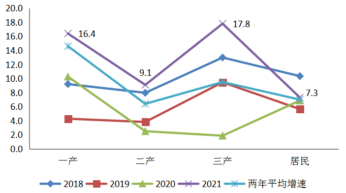 從2021年的兩年平均增速來看,僅有一產用電增速高于2018、2019年水平,二產、三產及居民生活用電增速在2018和2019年間。