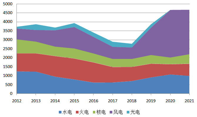 新增發電裝機總規模連續九年過億千瓦,2020年為歷年最高水平。2018、2019年受電力供需形勢變化等因素影響,水電、核電、太陽能發電新增裝機幾乎減半,導致兩年新增裝機規模連續下滑。2020年,在水電、風電、太陽能發電裝機高速增長的帶動下,新增裝機容量大幅提升。2021年受火電、風電新增裝機容量減少18%、34%的影響,整體新增規模同比降低7.9%。