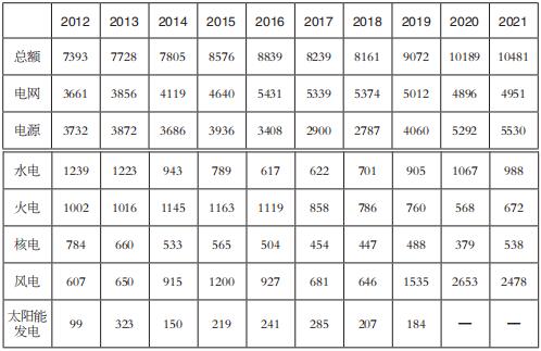表7 2012~2021年全國電力投資情況(單位:億元)