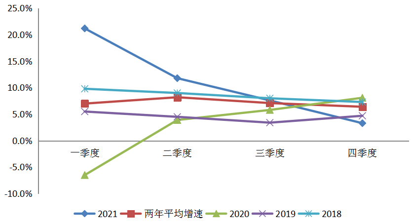 圖2 2018~2021年全國全社會用電量季度增速(單位:%)