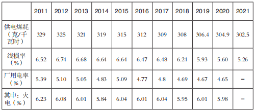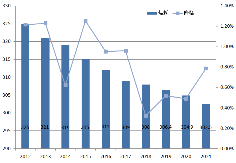 據國家能源局數據,2021年全國供電標準煤耗302.5克/千瓦時,同比再降2.4克/千瓦時,較2011年下降了26.5克/千瓦時。