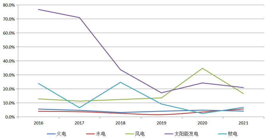 圖6 2016~2021年火電、水電、風電、太陽能發電、核電裝機增速情況