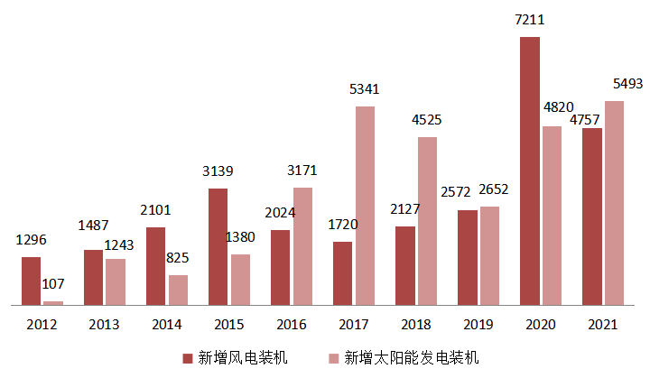 圖10 2012~2021年新增風電、太陽能發電裝機情況(單位:萬千瓦)