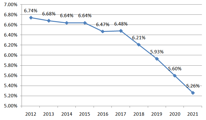 (二)全國線損率保持下降趨勢,2021年為5.26%