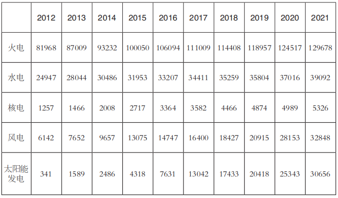 表3 2012~2021年全國電力裝機結構(單位:萬千瓦)