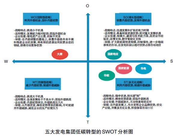 大唐集團:面對內部火電比例較高、火電廠經營不善、煤化工業務虧損等多重壓力和挑戰,大唐集團近年來發展相對滯后。因此,大唐集團需采取WO扭轉型戰略,積極推動企業轉方式、調結構、增動力、強活力,扭轉粗放發展方式,加強煤電與其他業務協同發展,實現煤電低碳轉型,利用有限的資源積極發展新能源業務,實現經營發展全面轉好的根本性轉變。