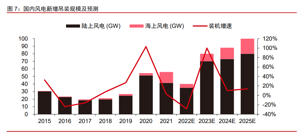 風(fēng)電:受疫情等因素影響,2022 年部分風(fēng)電項(xiàng)目裝機(jī)將延后至 2023 年。2022 年 1-11 月,國內(nèi)風(fēng)電新增并網(wǎng)量達(dá) 22.52GW(-6.8% YoY),預(yù)計(jì)全年新增并網(wǎng)規(guī)模達(dá) 40GW 左 右,同比或有所回落。這主要是由于疫情影響設(shè)備生產(chǎn)交付和項(xiàng)目現(xiàn)場吊裝節(jié)奏,同時(shí)疊 加機(jī)型方案升級(jí)換代,以及部分項(xiàng)目場址審批周期拉長影響。我們預(yù)計(jì)有 10GW 左右陸上 風(fēng)電項(xiàng)目裝機(jī)將由于外部因素由 2022 年延至 2023 年,短期裝機(jī)需求低于預(yù)期或?yàn)?2023 年需求復(fù)蘇進(jìn)一步夯實(shí)基礎(chǔ)。隨著疫情影響逐步緩解,風(fēng)電經(jīng)濟(jì)性大幅提升,以及 2022 年部分延遲項(xiàng)目結(jié)轉(zhuǎn),2023 年國內(nèi)風(fēng)電裝機(jī)有望顯著復(fù)蘇,預(yù)計(jì)總裝機(jī)量將達(dá) 80GW 左 右,其中海上風(fēng)電裝機(jī)有望實(shí)現(xiàn)翻倍增長至 10GW 以上,且 2023-25 年海風(fēng)裝機(jī)仍有望 維持約 40%的較高 CAGR。